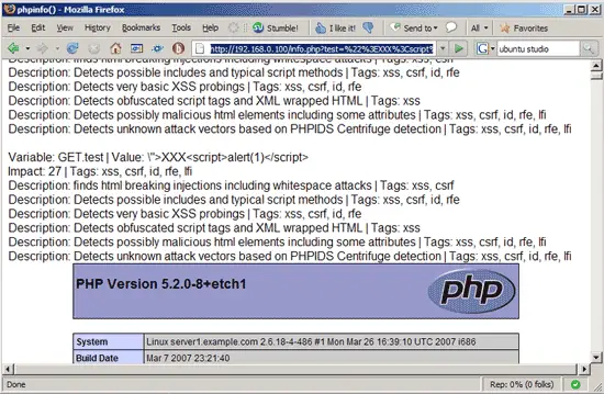 Now append some malicious parameters to the URL (e.g. http://192.168.0.100/info.php?test=%22%3EXXX%3Cscript%3Ealert(1)%3C/script%3E), and you should find a PHPIDS report before the phpinfo() output (because /var/www/web1/web/phpids.php was executed before /var/www/web1/web/info.php):