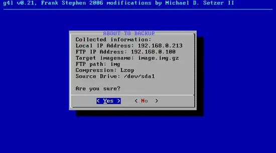 Ghost4Linux shows you a summary of your settings. Select Yes to start the backup: