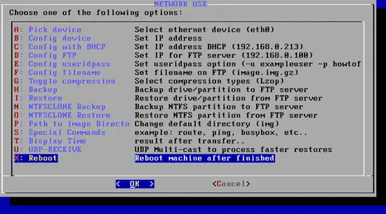 You will be directed to the main menu. Select X - Reboot machine after finished to reboot the system. Remove the Ghost4Linux CD from the CD drive and boot the original system (e.g. your Ubuntu desktop). Thanks to the restoration you should now find your files again on the hard disk.
