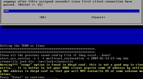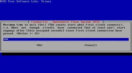 Fill in the max. time (in seconds) that the server will wait until all clients are powered on (i.e., if you want to restore the image on ten clients, you have 300 seconds to power on the other nine computers after you have powered on the first one - if you are too slow, CloneZilla will start to restore the image only on the systems that have been powered on in time):