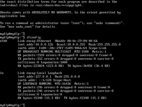 16. The MyDLP Appliance was configured to assign itself an IP Address from a DHCP server automatically. In order to move on from here, and complete installation, we should learn the assigned IP address. Unix command ifconfig will list all enabled network interfaces and their IP addresses. In this example, it is 10.0.0.126. Or as an alternative, we can assign a static IP address for our Ubuntu Box. This is also explained here.