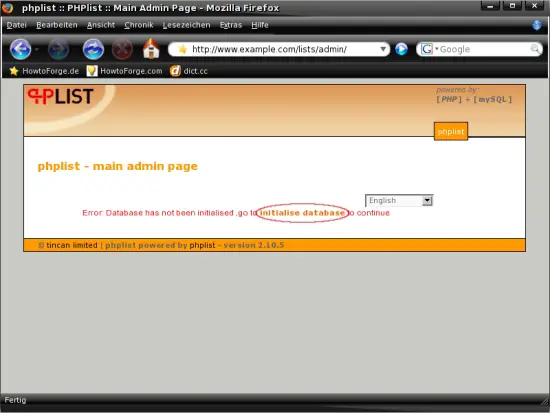 At this point we're ready for the installation. Open http://%vhost_domain%/lists/admin (e.g.: http://www.example.com/lists/admin) within your preferred browser. Click on "initialise database" to create the needed database structure.