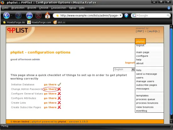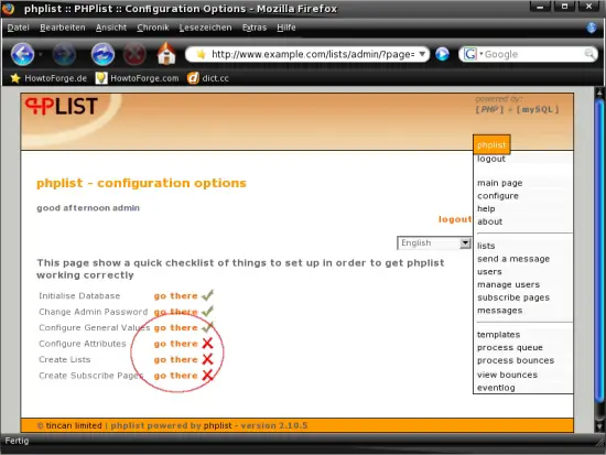 The remaining points of the checklist require individual, extensive configuration. Please have a look at the documentation if you have problems with the configuration and to find out how to use phplist.