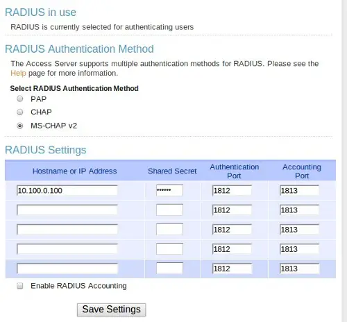 Once you specify that Radius is to be used, click on the Radius link to enter the details. When you submit the information, you will be prompted to updated the running server. Don't bother with that yet.