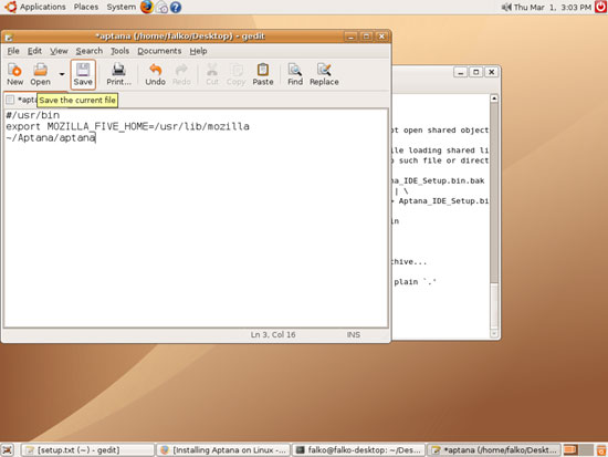 The installation isn't fully finished yet. We must create a short start script which we will name aptana and place in the /usr/bin directory. The purpose of this script is to set an environment variable (MOZILLA_FIVE_HOME) for Aptana and then start it.