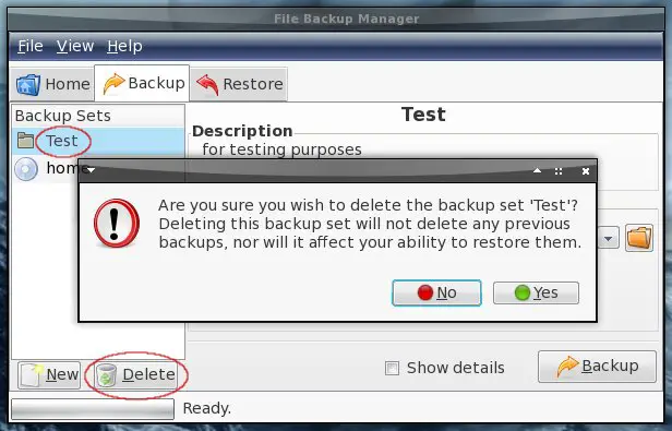 If you want to delete a backup set, select it on the left and click on "Delete". Proceed if you really want this.