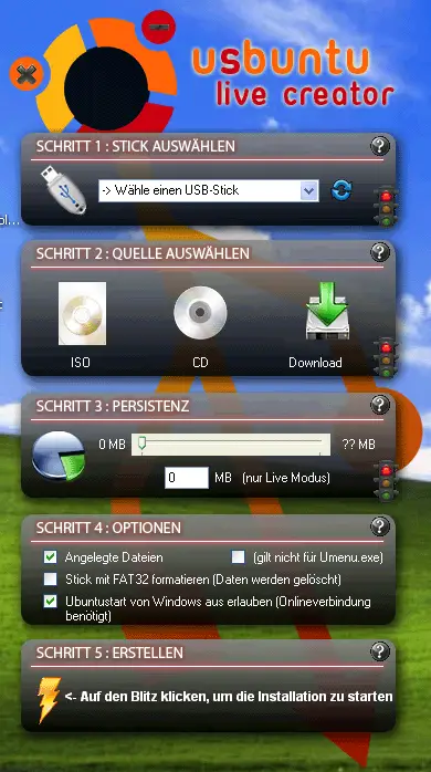 Now select the USB thumb drive on which you want to put the Ubuntu live system (if you've plugged your USB thumb drive into your computer only after you've started uSbuntu Live Creator, click on the refresh icon to make the thumb drive available). In step 2, select the source medium for the Ubuntu 8.10 live system (e.g. an Ubuntu 8.10 ISO file or an Ubuntu 8.10 CD). In step 3, you can reserve some space on the thumb drive for persistent files so that your changes that you make on the Ubuntu 8.10 live system won't be lost when you shut down the live system. In step 4, you can change some options, but normally the default ones are ok. Afterwards, click the thunder icon to start the installation to the thumb drive: