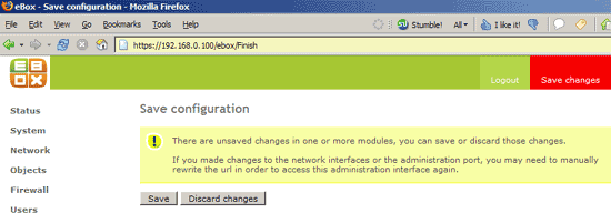 After you have clicked on the red rectangle, another screen comes up telling you to save the configuration which is a little bit long winded. Anyway, click on Save: