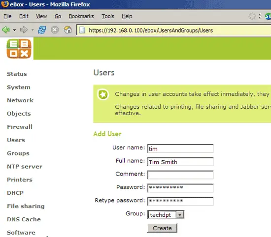eBox lets you also create users that can be put in the groups you created before, thus inheriting the group permissions, but you can also assign individual permissions to each user. In this example, I create two users: tim in the group techdpt and bob in the group salesdpt: