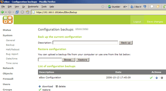 Under System -> Backup, you can back up your current eBox configuration, so if you lose your eBox configuration, you can restore it from the backup: