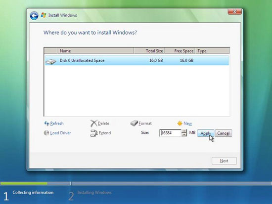10. You should now see four different options (Delete, Extend, Format, and New). Click on New and then choose how much space you want to give the new partition. Click Apply to create the new partition. When you are satisfied click Next to finish up.