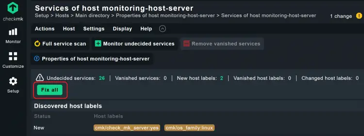 - Click on 'Fix all' to monitor all of these. That will add all of the detected services and host labels to the monitoring and will also remove services that have 'vanished'. You can manage the services manually, of course, but this way is a lot faster.