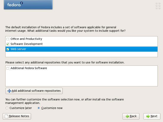 Now we select the software we want to install. Uncheck Office and Productivity and check Software Development and Web server instead. Then check Customize now, and click on Next: