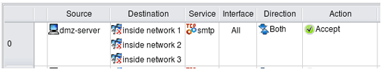 Things get more complicated if we have several networks inside and want to build a rule to permit connects from a server on DMZ to everywhere except for the three internal networks: