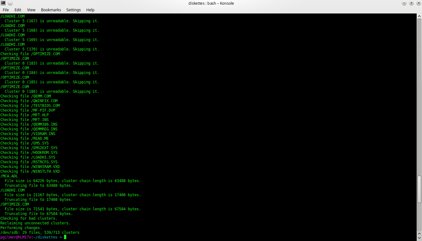It should show 720 records read. Oops! 104? Not altogether unexpected. Some of these diskettes are 30 years old. So now what? I tried using the fsck command, but I didn't get very good results. Fortunately, the dosfsck command can help us out. This command is part of the repository package dosfstools. If not already installed on your system, install the package. On a Debian-based system like Linux Mint, you can install with the command: