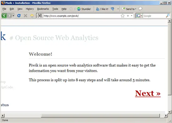 Then refresh the Piwik page in your browser. You should now see the welcome page of the installer. Click on Next:
