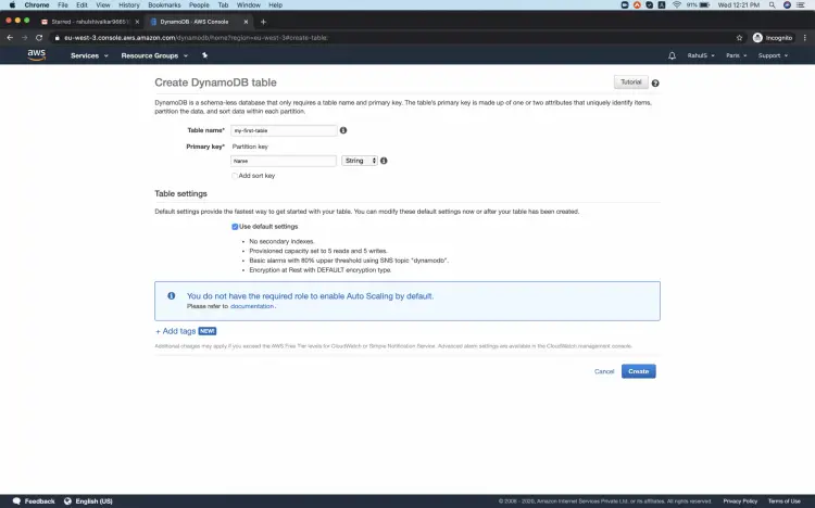 You will see the homepage of Amazon DynamoDB. To create a table click on" Create table"