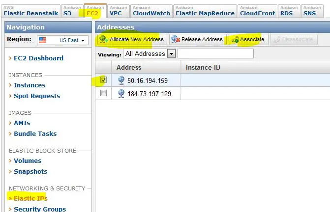 To do this, select the IP and click on the Associate button (see the image) and then a small window named Associate Address will be displayed, and there you must choose the ID of your virtual machine from a list (in my case I have only one, therefore I can only select that one option), and then click on the Associate button.