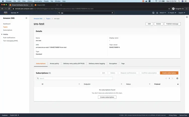 Here, you will see the existing SNS topics in your account under the selected region. I will be using the "sns-test" SNS topic. Click on the desired topic to see its details.