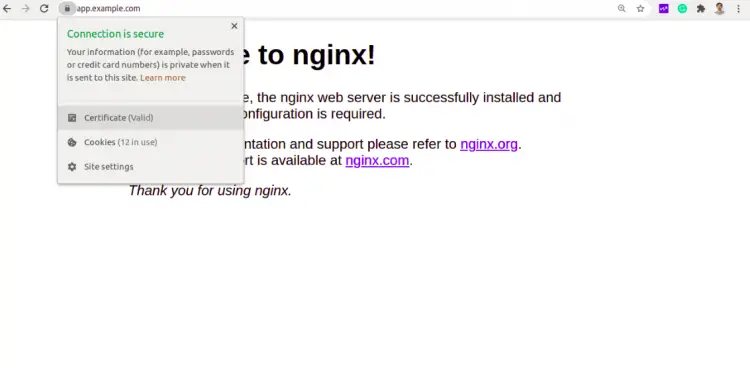 Now, open your web browser and type the URL https://app.example.com. You should see that your domain is secured with Mkcert.