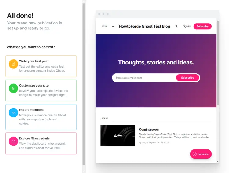This concludes our tutorial on how to set up Ghost CMS on your Debian 12 server using Nginx. If you have any questions or any feedback, share them in the comments below.