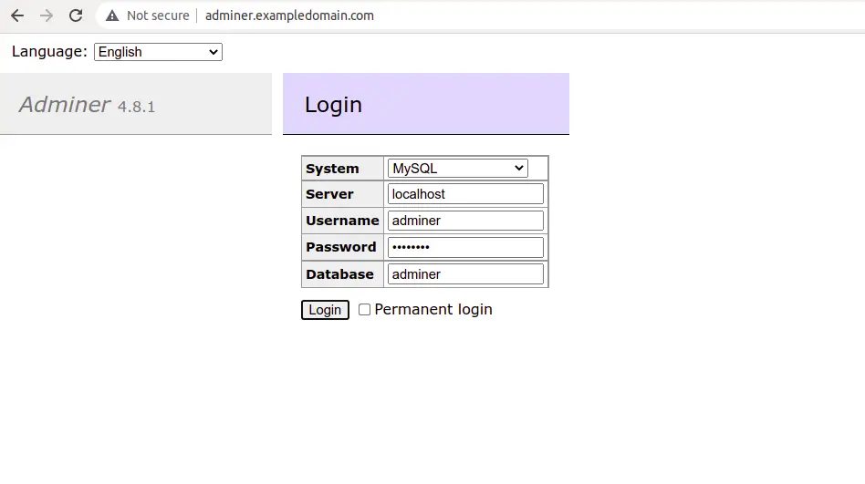 Now, open your web browser and access the Adminer web interface using the URL http://adminer.exampledomain.com. You should see the following page: