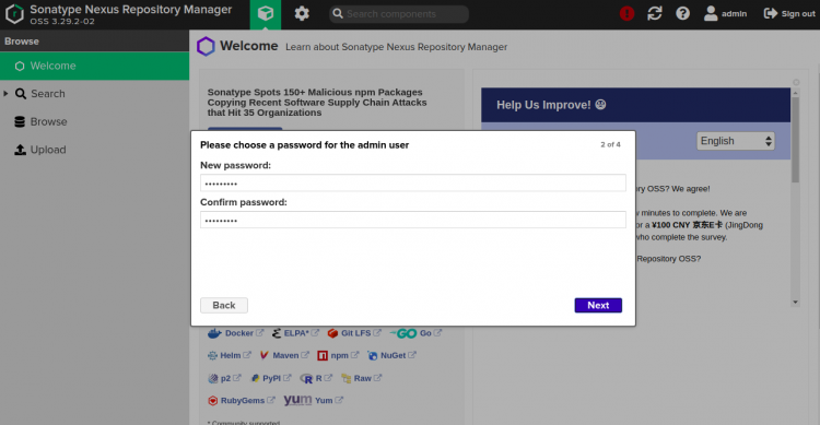 Provide your admin username, password and click on the Sign in button. You should see the Nexus setup page: