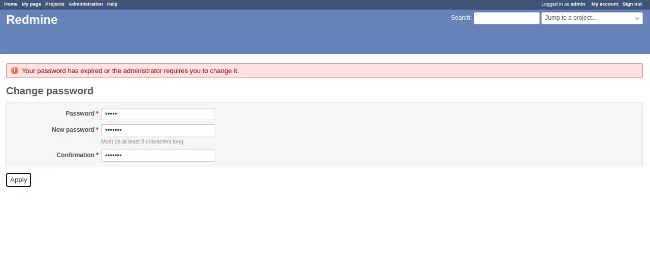 Provide the default user and password as admin then clicks on the Login button. You will be redirected to the change password screen: