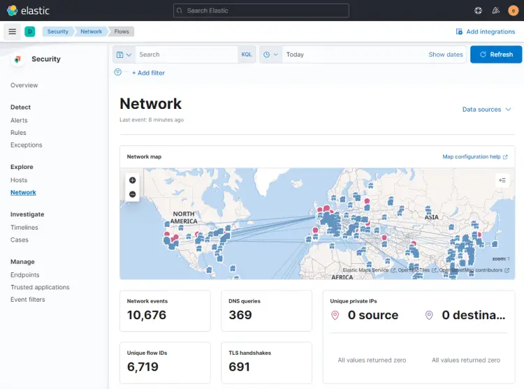 You can use Kibana and Filebeat to access and generate other types of dashboards. One of the useful in-built dashboards that you can right away is the Security dashboard. Click on the Network dashboard from the left hamburger menu, and you will get the following screen.