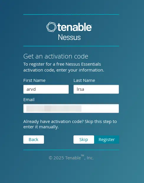 Register to Tenable by entering your first and last name, and email address. The activation code will be sent to your email, so make sure to use the proper email.