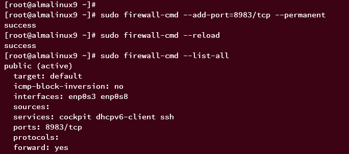 If the firewalld configuration is successful, you should see port 8983 on the firewalld list rules.