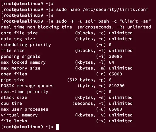 sudo -H -u solr bash -c "ulimit -aH"