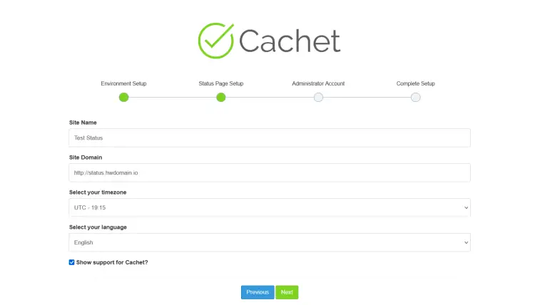 Now set up the status page name, default timezone, and the default language. Then click Next again.