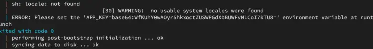 At the verbose logs from the Cachet container, you'll find an error about the APP_KEY configuration. Copy the generated APP_KEY and press Ctrl+c to terminate containers.