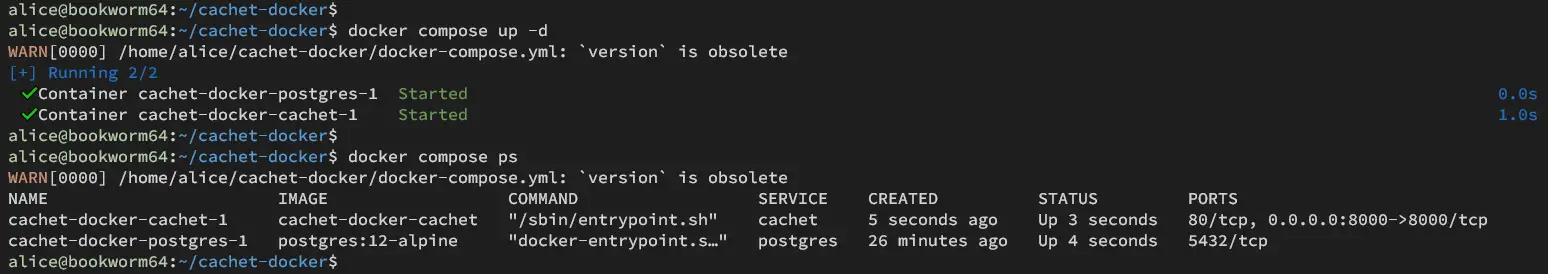 As you can see below, both Cachet and PostgreSQL containers are running. The Cachet container is running on port 8000.