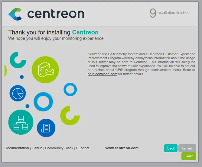 Click on the Finished button and login into Centreon admin user and password as we had set during installation.