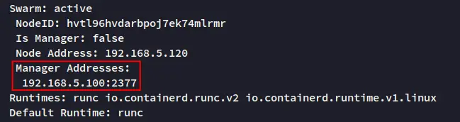 But, on the "worker1" and "worker2" servers, you will see the output like the following. You can see the Swarm Manager IP address with the default TCP port 2377.