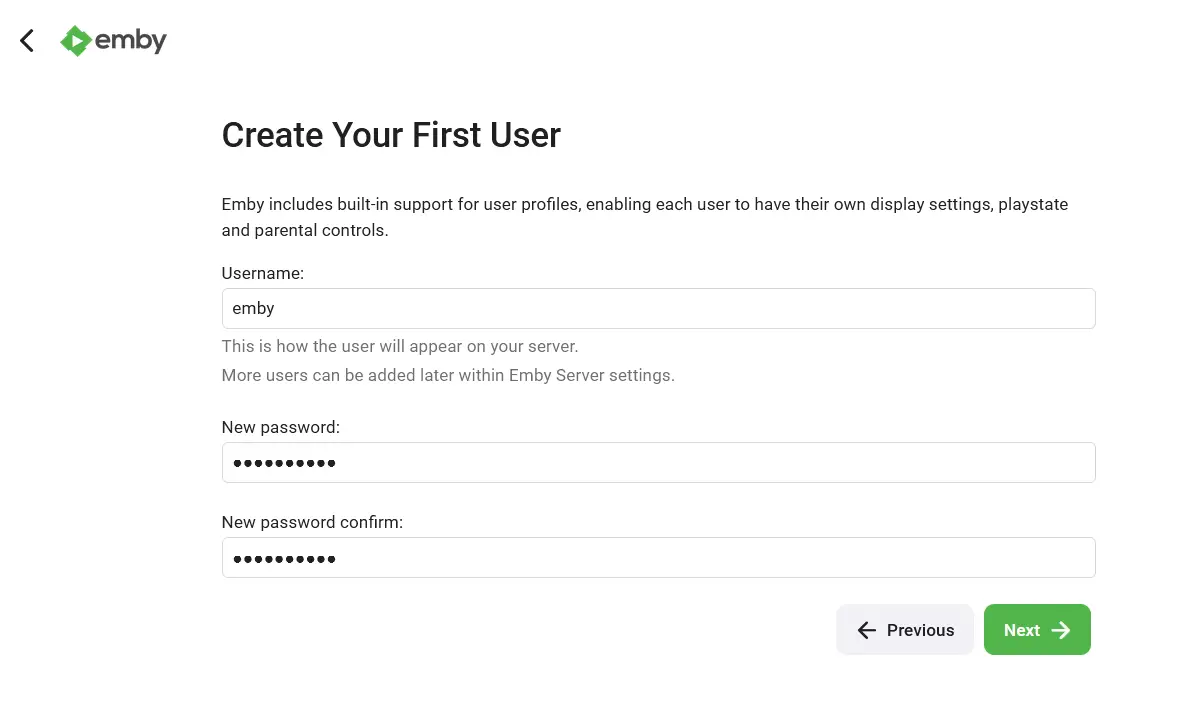 Now create a new user for your Emby installation and input the detailed user and password. Click Next to confirm.