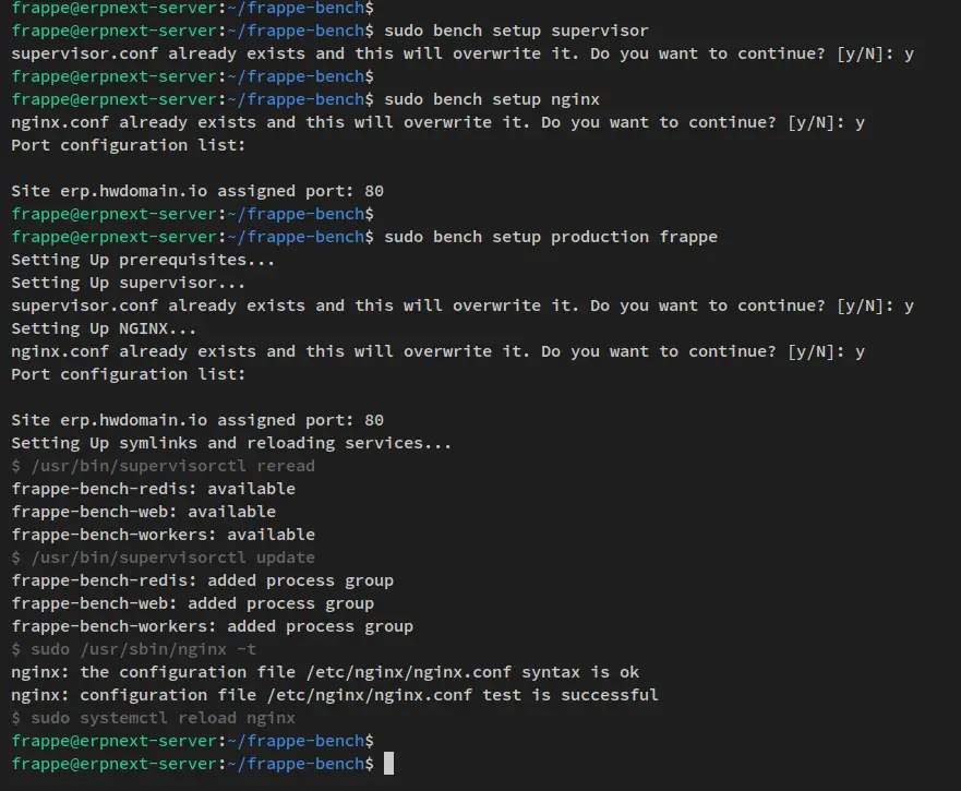 Next, run the below bench command to set up Nginx and Supervisor for the ERPNext. When asked to overwrite the current settings, input y to confirm and press ENTER.