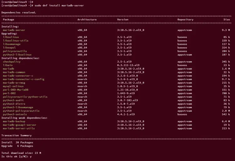 Run the dnf command below to install MariaDB Server. When prompted, input y to confirm and press ENTER.