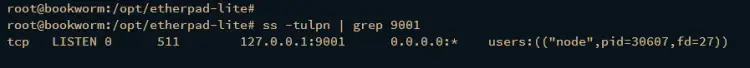 Enter the ss command below to ensure that port 9001 is used by the Node.js application, which is Etherpad.