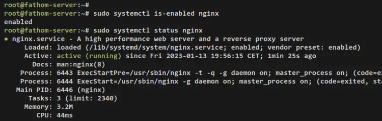 You should receive an output such as Nginx service is running and it's enabled, which means the service will start automatically upon the bootup.