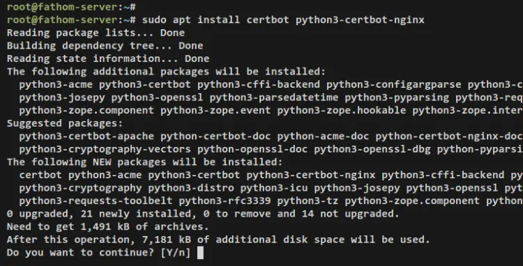 Now run the below apt command to install the Certbot and the Certbot Nginx plugin. Input y when prompted and press ENTER to proceed.