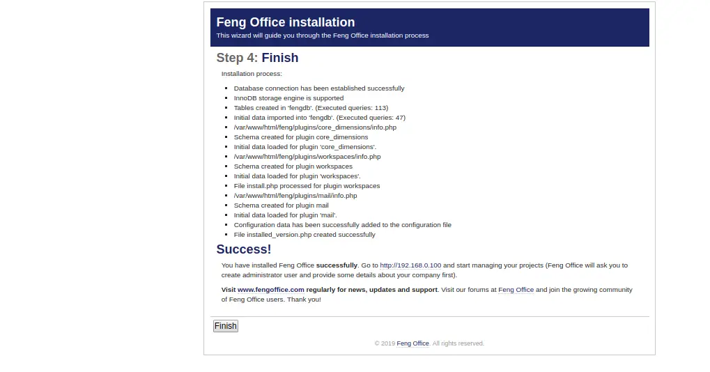 Congratulations! you have successfully installed, configured and secured Feng Office on Debian 10 server. You can now easily manage your project with Feng Office web interface.