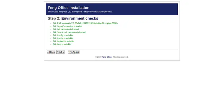 By default, Debian 10 ships with PHP 7.3. You will need to install PHP version 7.1 to work Feng Office properly.