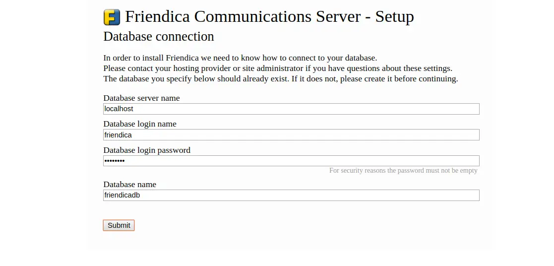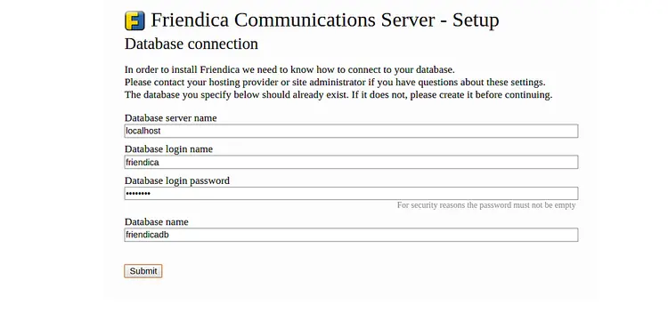 Provide your database credentials and click on the Submit button. You should see the following page: