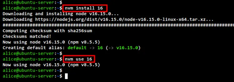 Run the nvm command below to install the Node.js v16 to your system. This installation will only affect the environment of the user alice.