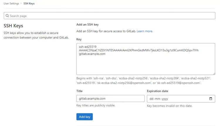 Open your profile settings in Gitlab and select the SSH Keys menu from the left sidebar.