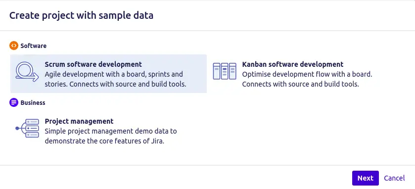 Select "Scrum software development" and click on the Next button. You should see the following screen: