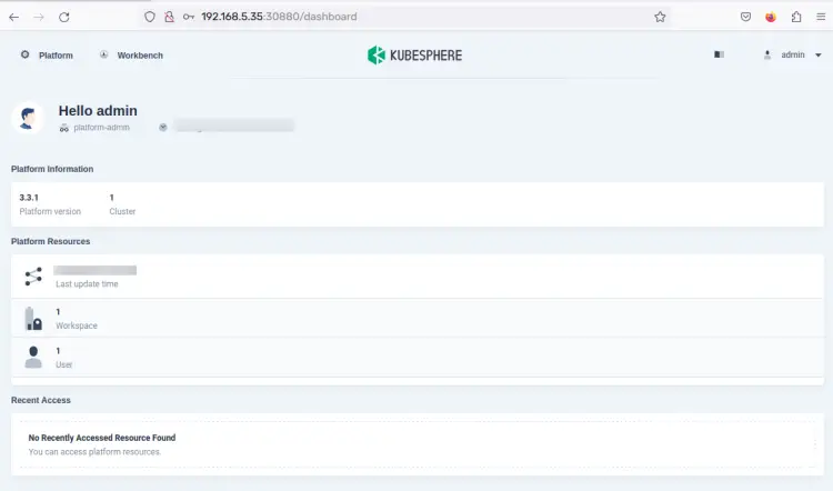 When finished, you should see the Kubesphere administration dashboard. On the dashboard page, you should get the current version of Kubesphere v3.3.1 and the available Kubernetes cluster is 1.